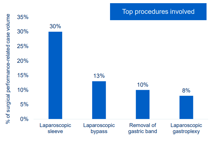 Laparoscopic sleeve is the most commonly cited procedure in bariatric surgery malpractice claims, with the top allegation being improper management of surgical patients.